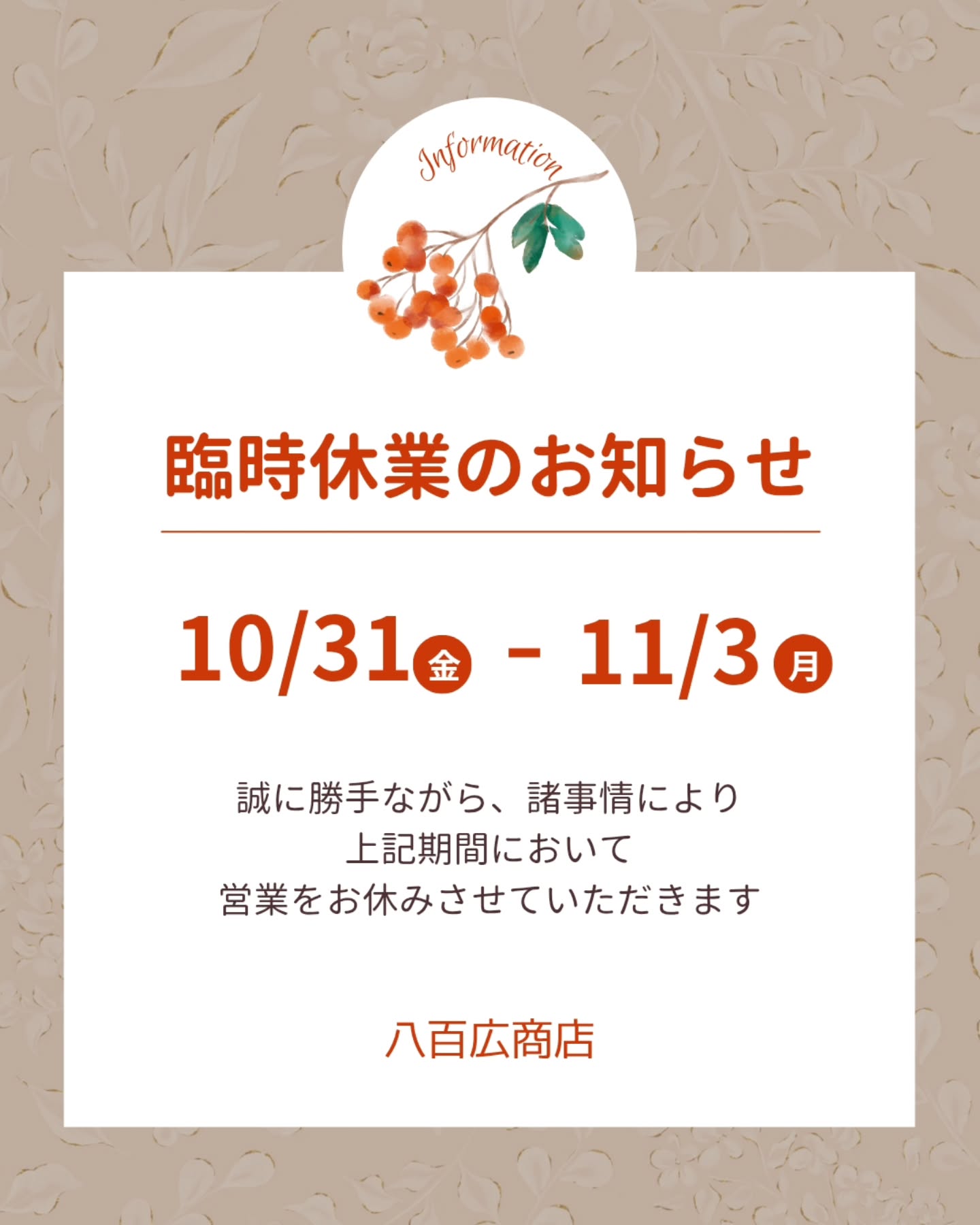 【臨時休業のお知らせ】10/31(金) 臨時休業11/1(土) 臨時休業11/2(日) 定休日11/3(月) 祝日のため休業日誠に勝手ながら上記の期間お休みさせていただきます。11/4(火)から通常営..