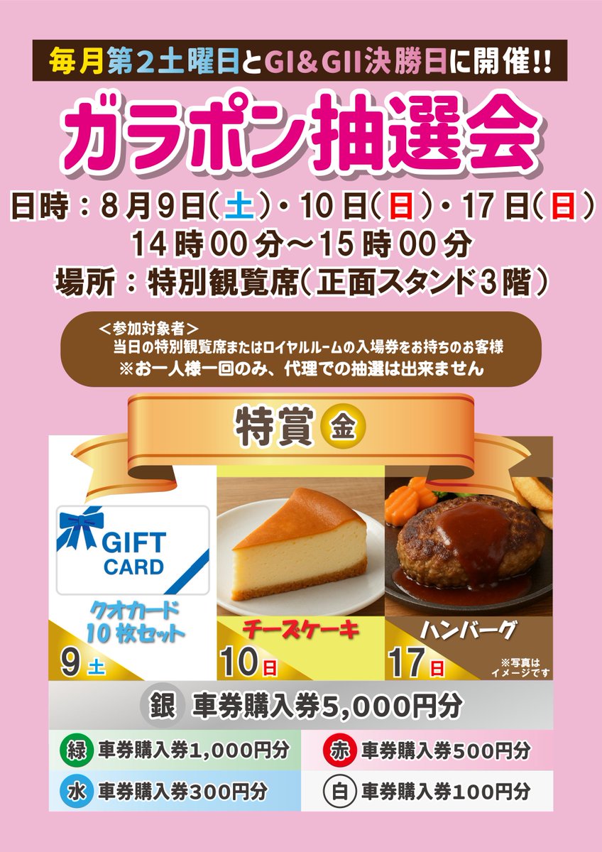 明日、8月10日(日)も14時~15時に正面スタンド3階にて「ガラポン抽選会」を開催します! 皆様のご参加、お待ちしております ※参加には、当日の特別観覧席またはロイヤルルーム入場券が必要になります。 #名古屋競輪場 #競輪