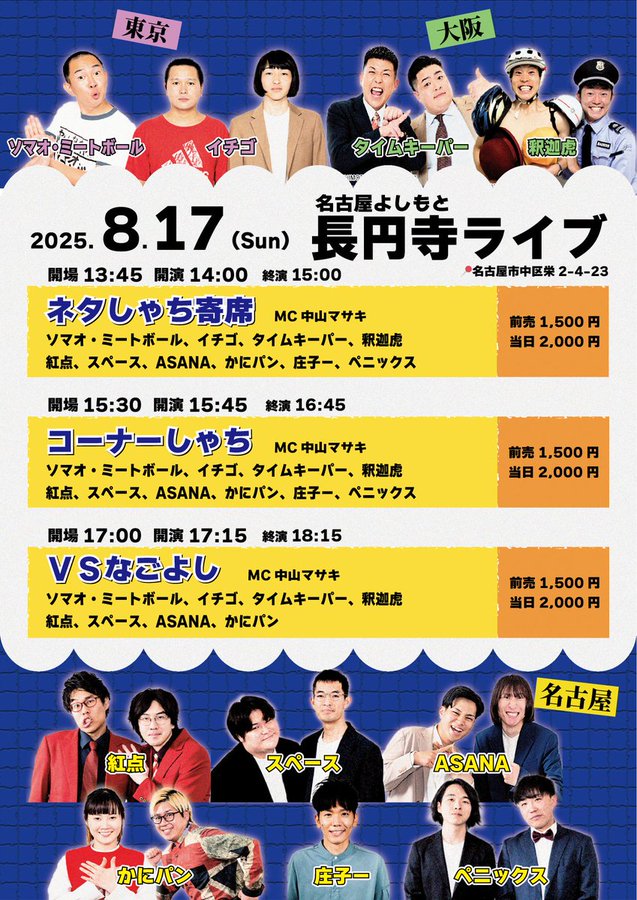 ■━━━━━━━━━□ 今週末 8/17(日) 長円寺ライブ https://x.gd/zx0Yv □━━━━━━━━━■ 13:45開場|14:00開演 ネタしゃち寄席 MC:中山マサキ