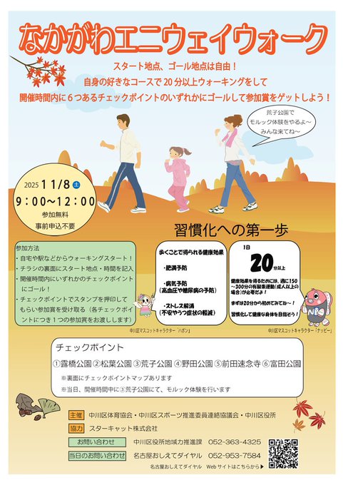 【地域力推進課】11月8日(土)午前9時から正午まで中川区内各所にて、なかがわエニウェイウォークを開催します。自身の好きなコースで20分以上ウォーキングして参加賞をゲットしよう!詳細はチラシをご覧くだ..