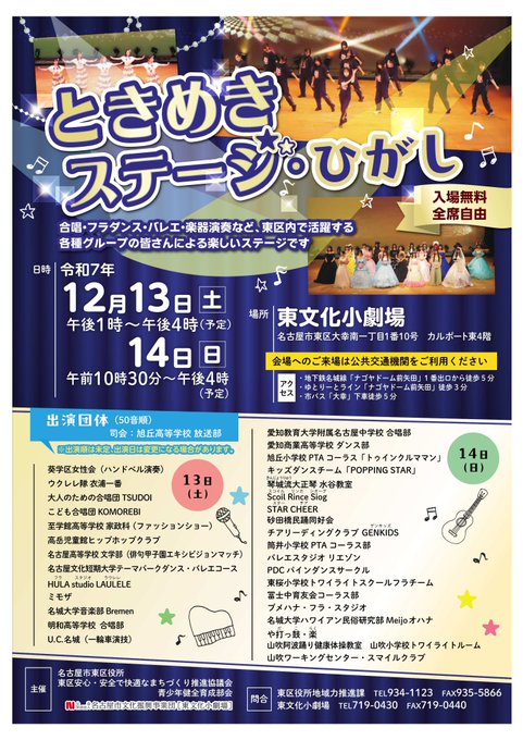 ときめきステージ・ひがしを開催します!12/13(土)、14日(日)に東文化小劇場で合唱・フラダンス・バレエ・楽器演奏など、東区内で活躍する各種団体グループの皆様のイベントです!明日から出演団体を紹介..