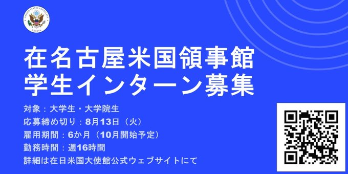 【学生インターン募集!】在名古屋米国領事館広報部は、大学生・大学院生を対象にインターンを募集します。申し込み締め切りは8月13日(火)詳細はこちら↓https://jp.usembassy.gov/j..
