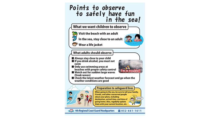 海・川での事故に気をつけて! 海や川などの水辺で遊ぶときは 大人の方もお子様も 「守ってほしいこと!」をよく読んで 安全に楽しく遊びましょう♪ 英語・スペイン語・ベトナム語・タガログ語 の案内です
