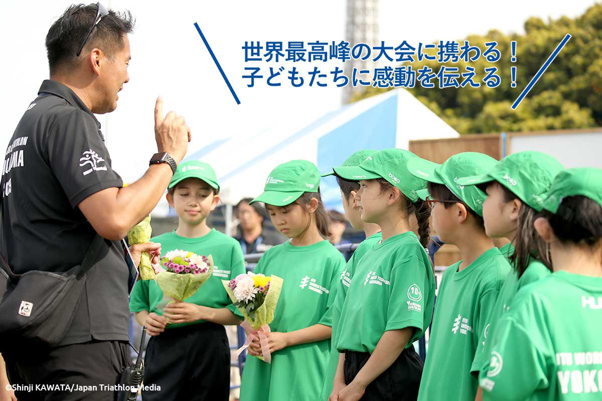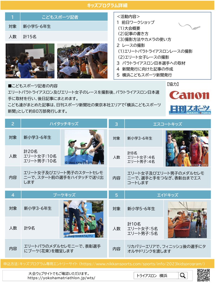 2023 #ワールドトライアスロン横浜大会 では選手とのハイタッチ、表彰選手のエスコート、選手への取材体験など、様々な場面で選手と触れ合うことができる「#キッズプログラム」を4年ぶりに実施します。