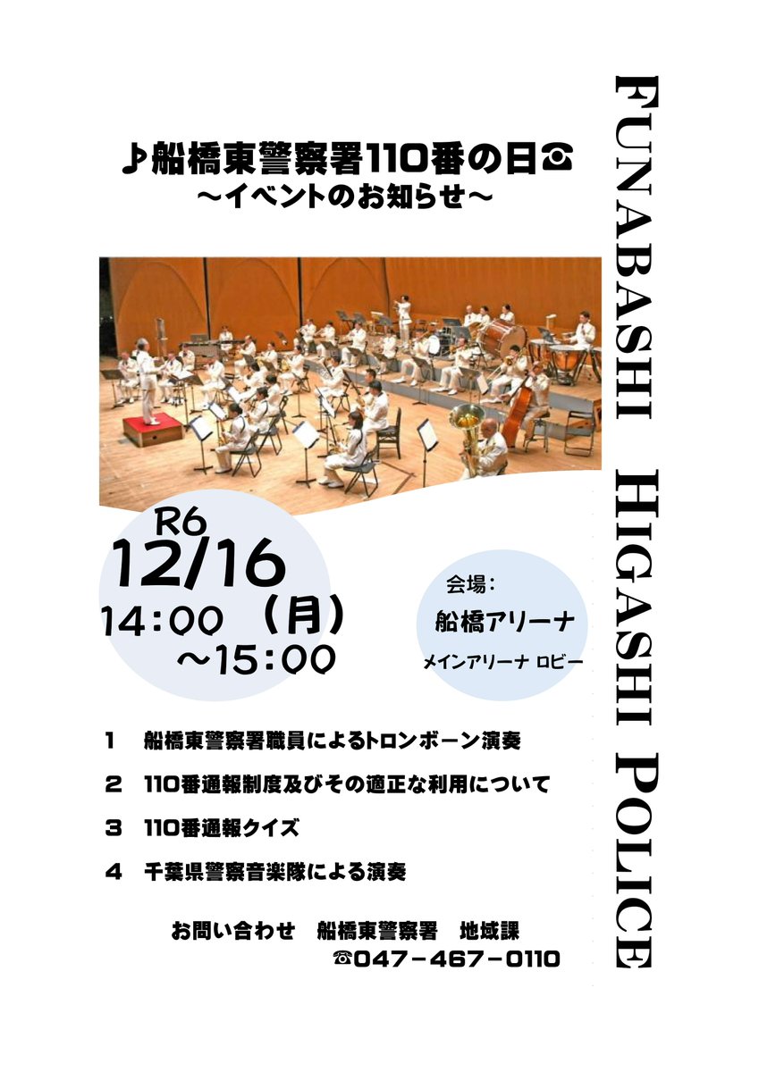【#船橋東警察署110番の日イベント開催】令和6年12月16日(月)14:00~15:00まで、#船橋アリーナメインアリーナロビーにて、署主催の110番の日イベントを開催しますぜひご来場ください(問い..
