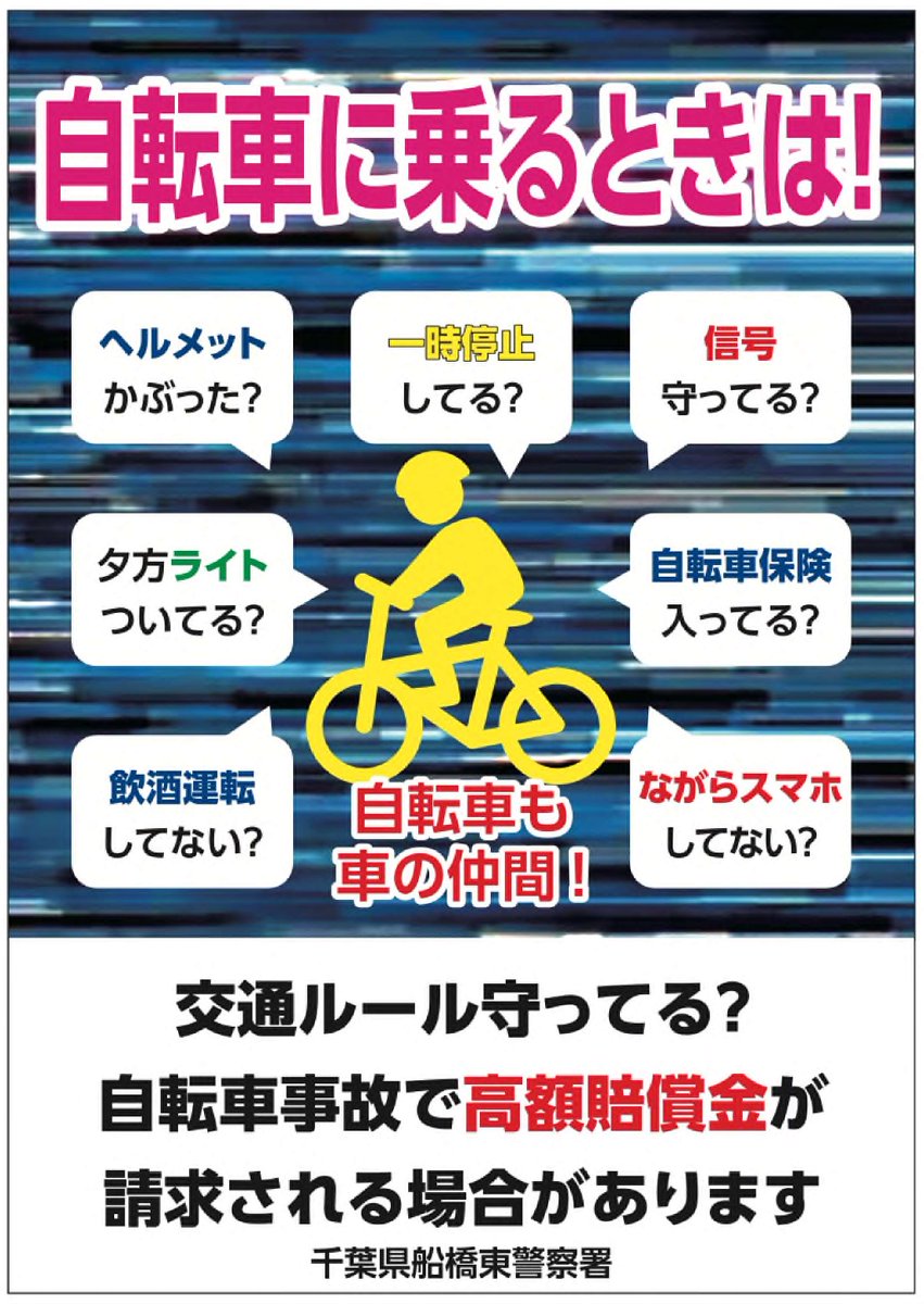 【#船橋東警察署からのお知らせ】自転車に乗るとき、交通ルールを守っていますか?自転車事故で、高額な賠償を請求される場合があります。皆さん、交通事故を起こさないように注意しましょう#千葉県警察