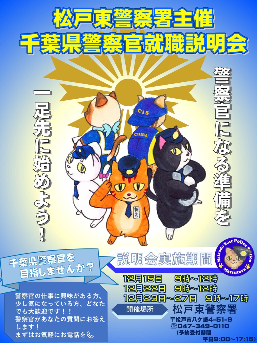 【松戸東警察署#就職説明会情報】松戸東警察署では12月に就職説明会を実施します23日~27日は希望者の時間に合わせて実施します警察官に聞きたいことや、鑑識体験等体験してみたいことがあればご相談下さい!..