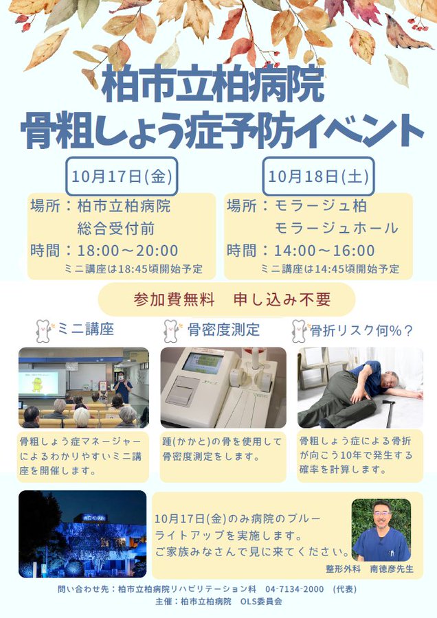 #市立柏病院『骨粗しょう症予防イベント』開催各専門職によるミニ講座や骨粗しょう症検査等を実施しますぜひ、ご家族でお越しください10/17(金)18:00~20:00@柏市立柏病院※病院のブルーライトア..