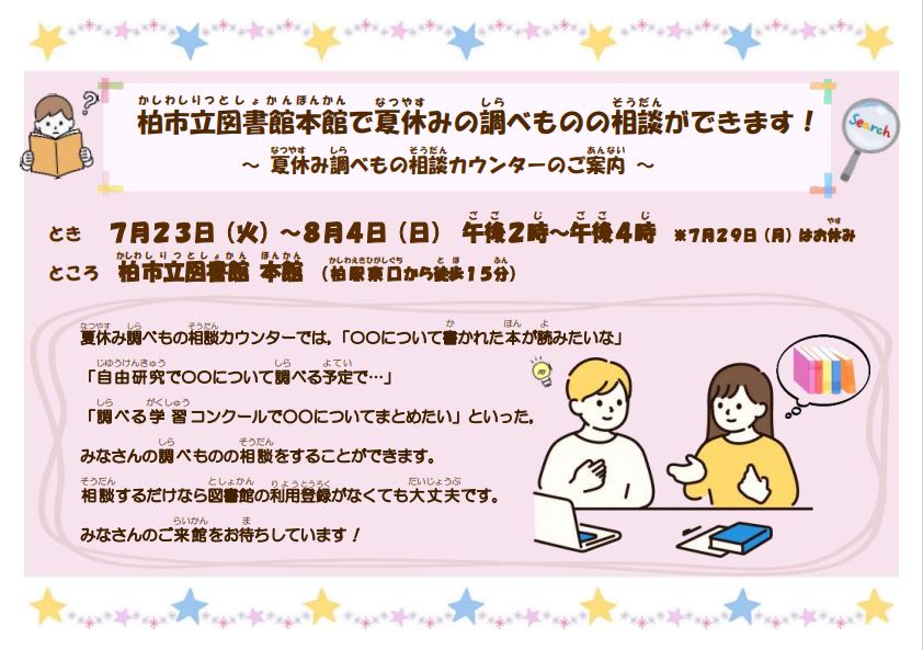 【本館】柏市立図書館本館では,7月23日(火)~8月4日(日)(休館日は除く)の各日午後2時~午後4時まで,「夏休み調べもの相談カウンター」を設置します。自由研究などの調べものの相談をすることができま..