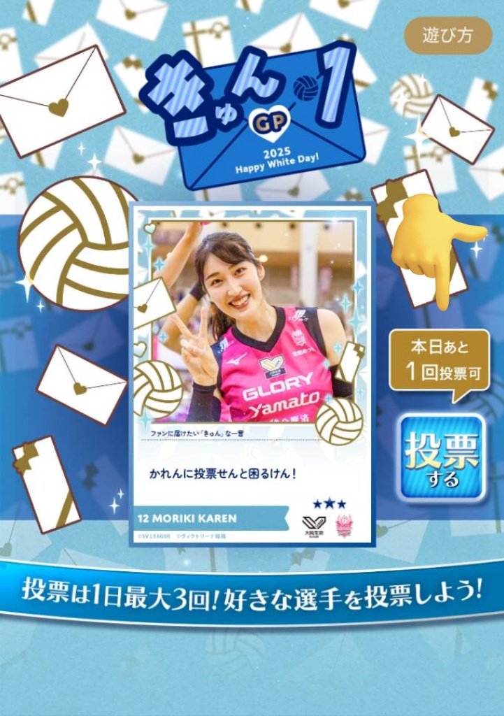 Xとインスタで#きゅん1GPの投票が始まりました#ヴィクトリーナ姫路からはみらくるまじかる超はっぴーな#森木かれん選手がエントリーぜひ引用先のポストにいいね♡とRPをお願いします#Vコレからの投票も毎..
