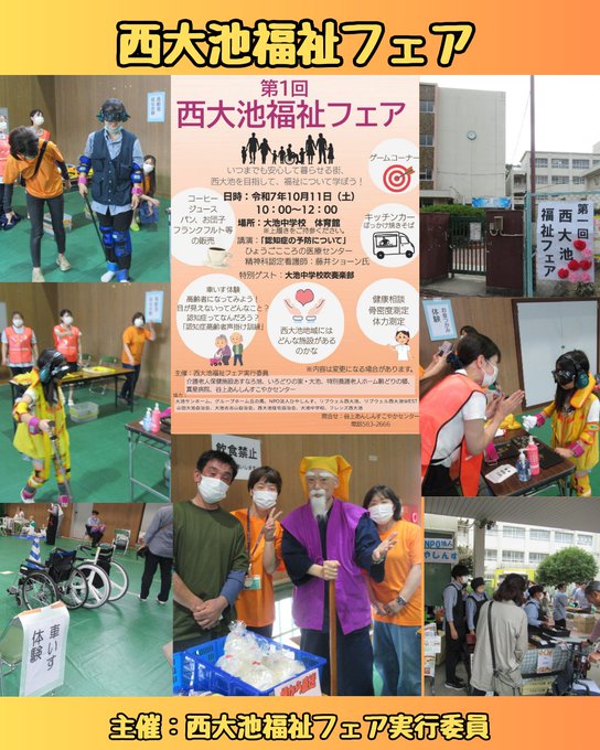 10月11日(土)開催の「西大池福祉フェア」へ伺いました。西大池地区の病院、施設、自治会、中学校が連携した初イベントで、子どもから大人まで多世代の皆さんが大勢参加されていました。「認知症の予防について..