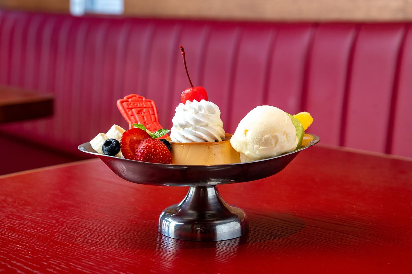 プリンアラモード🧁どこか懐かしい硬めプリンは、加古川産「日本一こだわり卵」を使用し、たまごの優しい..
