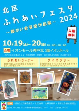 10月19日(土)・20日(日)の10~18時にイオンモール神戸北3階イオンホールにて「北区ふれあいフェスタ2024~障がい者芸術作品展~」が開催されます。100点を超える力作が展示され、簡単で楽しい..