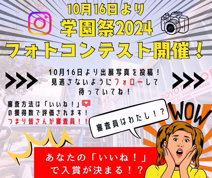 明日からトヨタ神戸校学園祭2024フォトコンテストが開催されます 皆さんが審査員です ご参加お待ちしております☆ #トヨタ神戸自動車大学校 #トヨタ #専門学校 #学園祭 #フォトコンテスト #審査員はあなた