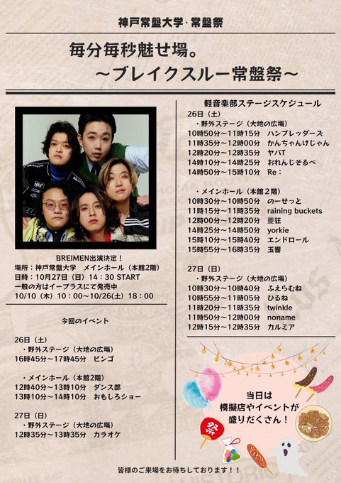 神戸常盤大学 常盤祭 とき 2024年10月26日(土)・27日(日) お待ちしています♪ BREIMENさまご出演決定 お申し込み イープラス https://eplus.jp/sf/detail/4170840001…