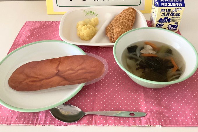 10月15日(火)の神戸市中学校給食の献立(中央区)パン豚肉と野菜のスープカリフラワーのマリネサケのフライ(タルタルソース)給食の献立等の産地情報はhttps://kobe-gk.jp/disclos..