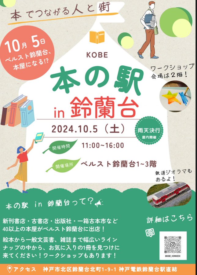 ベルスト鈴蘭台が、本屋になる!?新刊書店、古書店、出版社、一箱古本市など…40以上の本屋が集結!あなたのお気に入りの本をベルスト鈴蘭台で見つけてみませんか?日時:10月5日(土)11時〜16時場所:ベ..