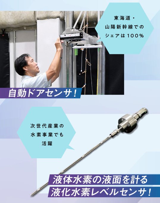 .すごい!神戸発の技術╰━v━━━━━━━╯東海道・山陽新幹線でシェア100%自動ドアセンサ次世代産業の水素事業でも活躍液化水素レベルセンサ次世代の移動手段を日常へ”空飛ぶクルマ”アイデアが生み出され..