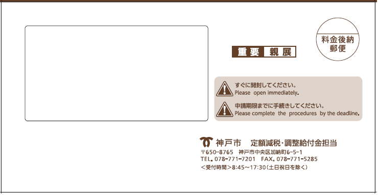 /定額減税に伴う調整給付金\対象の方へ書類を郵送しました茶色の封筒が届いた方は申請がないと支給されません締切9/30(消印有効)申請e-KOBEまたは郵送コールセンター078-771-7201くわしく..