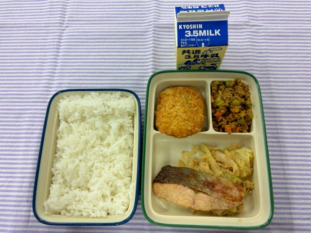 9月18日(水)の神戸市中学校給食の献立(ランチボックス)サケのレモン風味焼きキャベツとツナのソテーかぼちゃのコロッケカレー肉そぼろ給食の献立等の産地情報はhttps://kobe-gk.jp/dis..