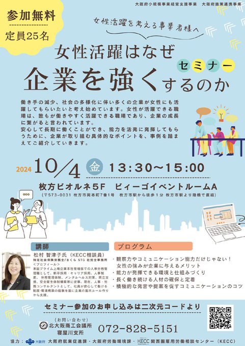 \女性活躍を考える事業者様へ/女性活躍はなぜ企業を強くするのかセミナー参加者募集誰もが働きやすく活躍できる職場にするために、企業が取り組む具体的なポイントを事例も踏まえてご紹介します!日時:10/41..