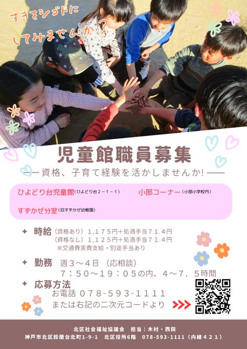 北区社会福祉協議会では、神戸市社会福祉協議会運営児童館の職員を募集しています。資格、子育て経験を活かして一緒に働きませんか?詳しくはチラシをご覧頂き、お気軽に問い合わせください。