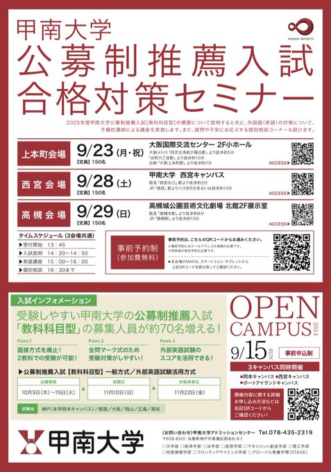\公募制推薦合格対策セミナー/9/23(月)、9/28(土)、9/29(日)に公募制推薦【教科科目型】の合格対策セミナーを開催するよ♪入試のポイント説明や英語の対策講座が受けられるから、ぜひ参加してね..