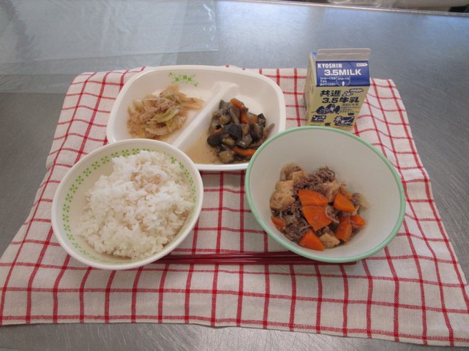 9月10日(火)の神戸市中学校給食の献立(中央区)ごはん牛肉のうま煮キャベツとツナのソテーなすと豚肉のさっぱり炒め給食の献立等の産地情報はhttps://kobe-gk.jp/disclosure/p..