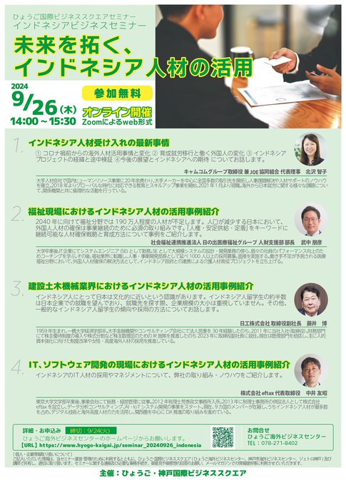 ひょうご・神戸国際ビジネススクエア主催「インドネシアビジネスセミナー」の開催~未来を拓く、インドネシア人材の活用~参加者募集インドネシア人材の活用事例や文化の違いをふまえた実践的な情報を提供します。詳..