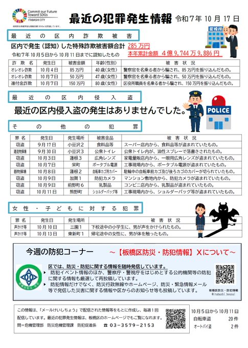 【最近の犯罪発生情報 令和7年10月17日号】 ・10/5~10/11の区内特殊詐欺被害額合計 →285万円 #BAN闇バイト #特殊詐欺 #防犯情報
