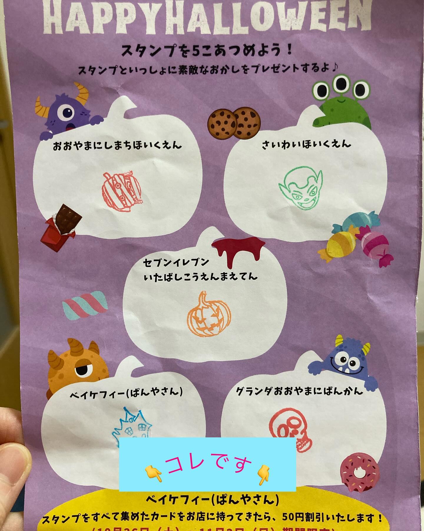 おはようございます♪本日はお休みです。先日のハロウィンイベントにご参加頂きありがとうございました🎃仮装をした可愛い子供達に私達も癒されました🥰その際のスタンプラリーの用紙がBacafeyの割引き券にな..