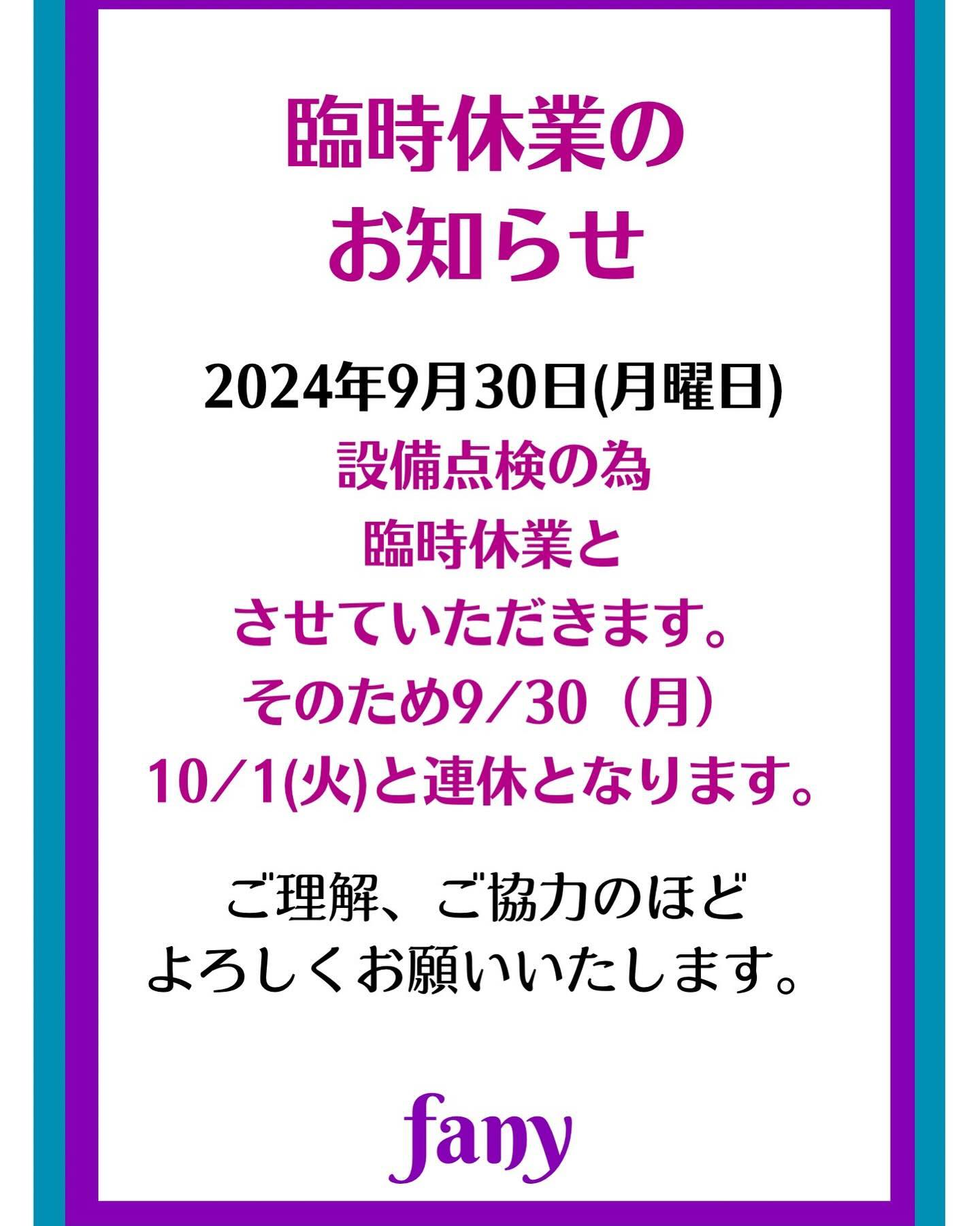 2024年9月30日(月曜日)店内設備点検の為臨時休業とさせていただきます。ご不便をおかけしますがご理解、..