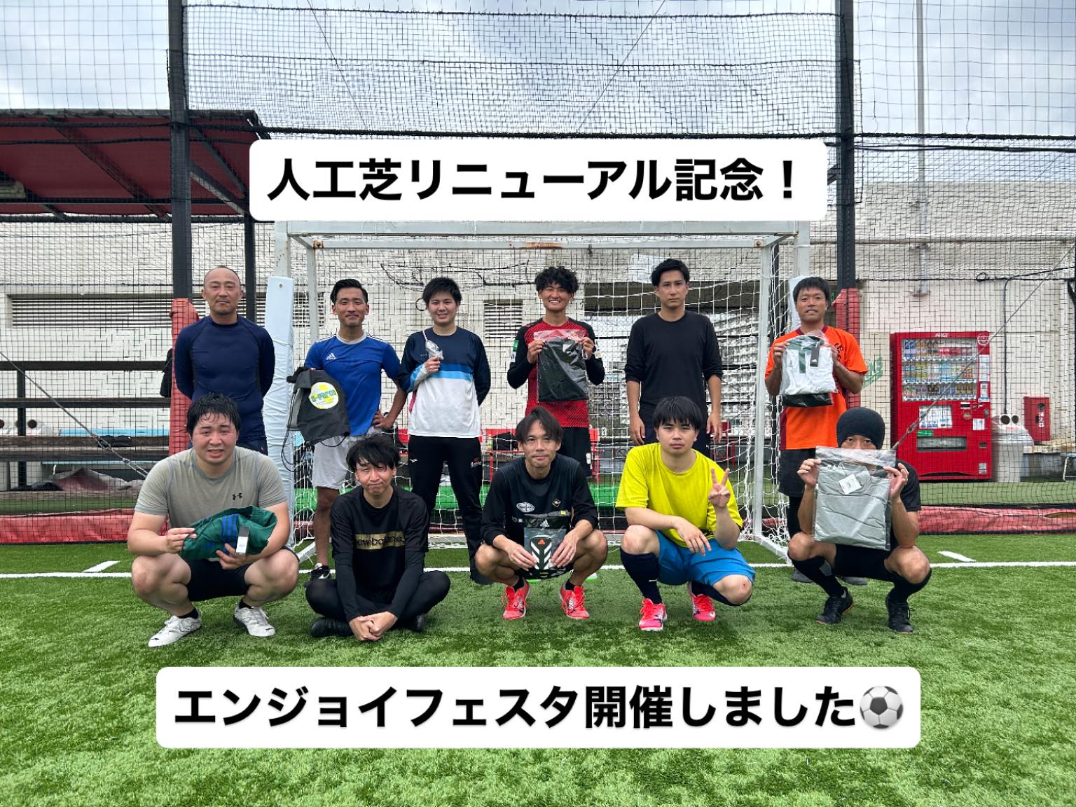 .【エンジョイフェスタ開催しました⚽️】.スポーツの日の本日、人工芝リニューアル後初のエンジョイフェスタ開催しました!11名のご参加と少し寂しかったですが、スタッフ入り4人3チームのキーパー助っ人で実..