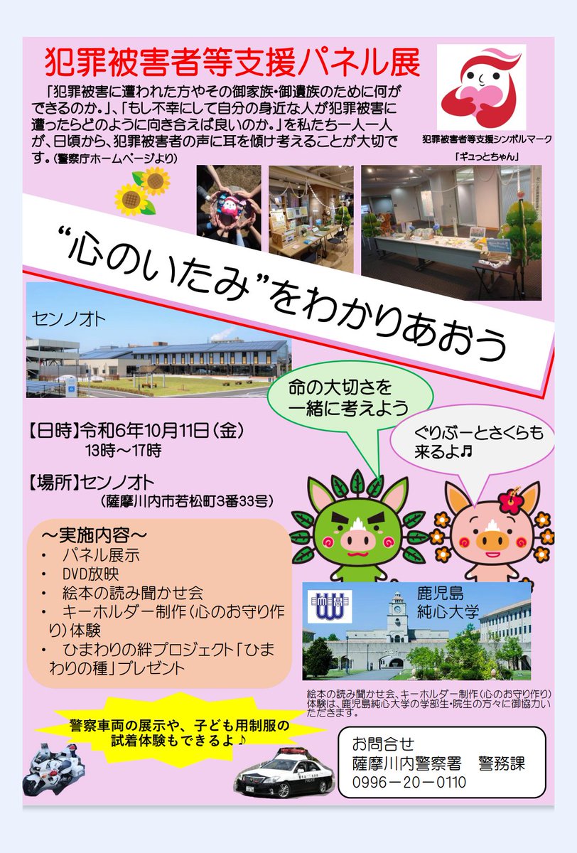 犯罪被害者等支援パネル展〜“心のいたみ”をわかりあおう〜を開催します。◯日時:令和6年10月11日(金曜日)午後1時から午後5時まで◯場所:センノオト(薩摩川内市若松町3番33号)お近くにお越しの際に..