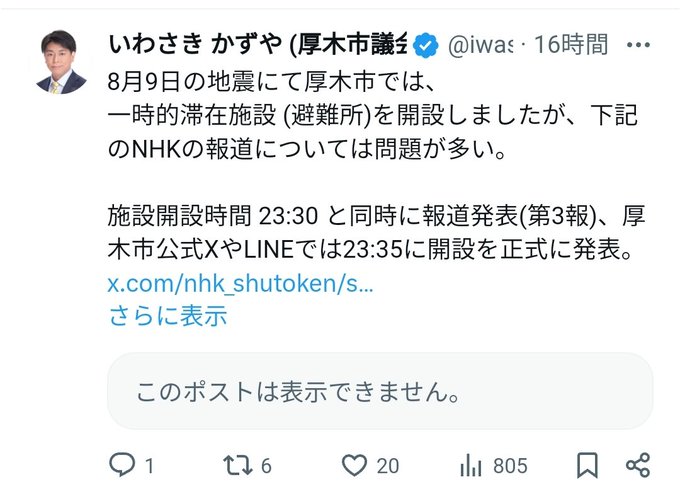 昨日、8月9日に発生した地震による厚木市の対応について NHK首都圏なるアカウント @nhk_shutoken が報道している内容が事実でなく、誤った報道である事を指摘しました。 驚くことに、朝起きたらツイ消しされて証拠隠滅。