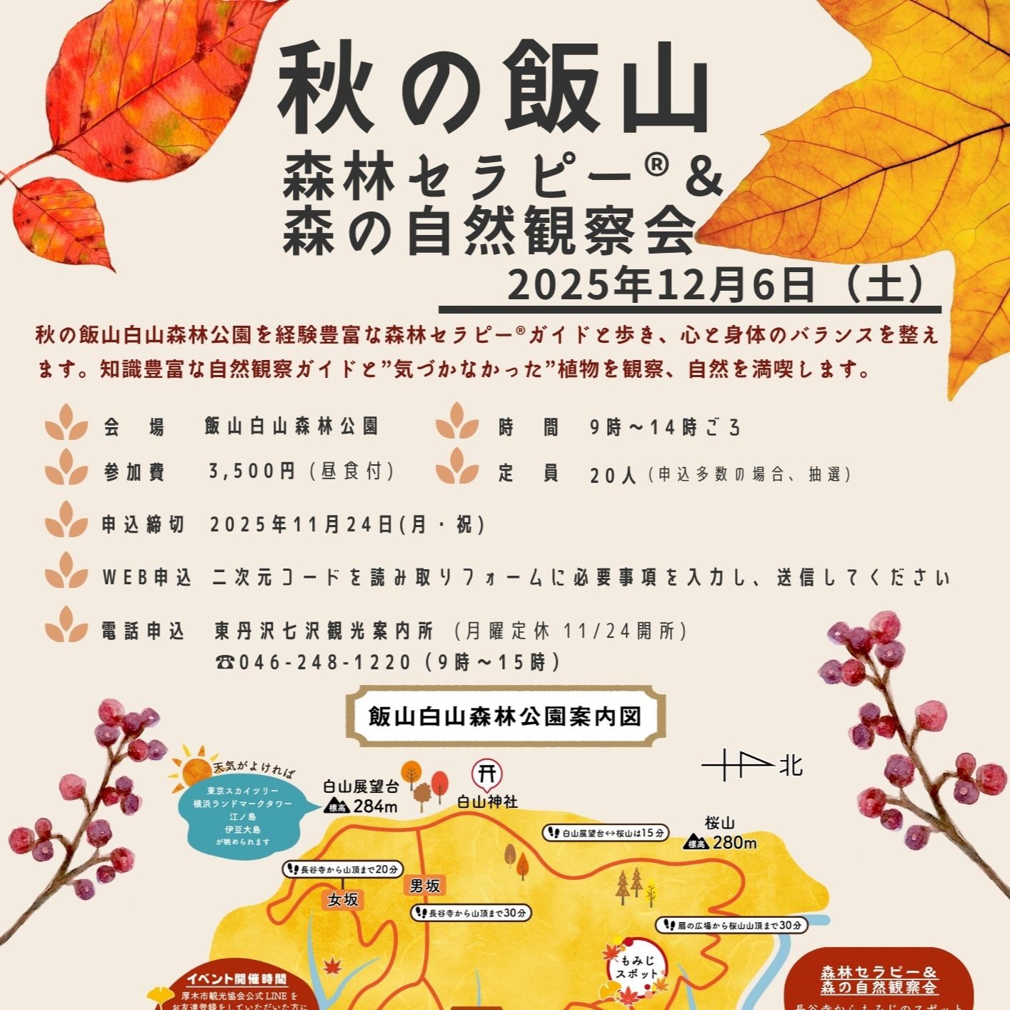2025年12月6日(土)秋の飯山森林セラピー🄬&森の自然観察会を開催します🌟森林セラピストが秋の飯山の森を..