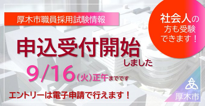 採用試験の受付開始令和7年度の採用試験(2回目)の申込受付を開始しました!保育士、土木、建築、環境化学等の試験を実施します。9/16(火)正午まで申込可能です。まずは厚木市ホームページをチェックhtt..