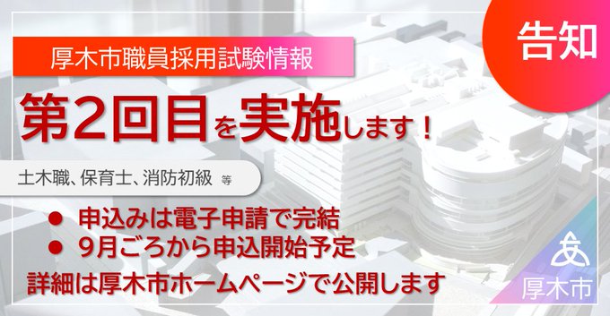 【厚木市職員採用試験情報】厚木市職員採用試験(第2回目)を実施します!募集職種や人数等の詳細は近日公開予定ですので、お待ちください。申込開始は9月を予定しています。厚木市職員採用情報サイトはこちら⇒h..