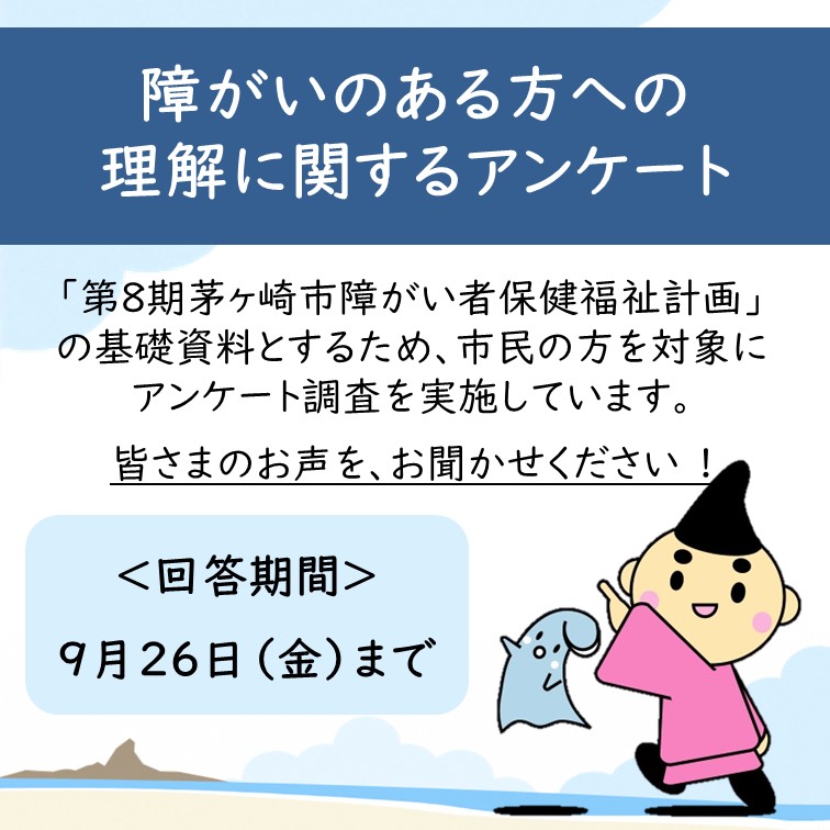 【お知らせ】令和9〜11年度を計画期間とする「第8期茅ヶ崎市障がい者保健福祉計画」策定の基礎資料とするため、9月26日(金)までアンケートを実施しています。誰もが自分らしく生きがいのある暮らしの実現に..