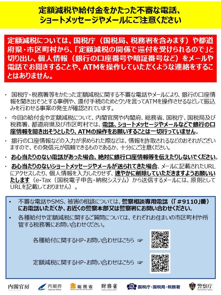 【定額減税をかたった詐欺に注意!】定額減税に関して、官公庁(国税局や役所等)から電話、ショ-トメッセージ、メール等で銀行の口座番号や暗証番号を聞いたり、還付金の手続きと称してATMの操作をお願いするこ..
