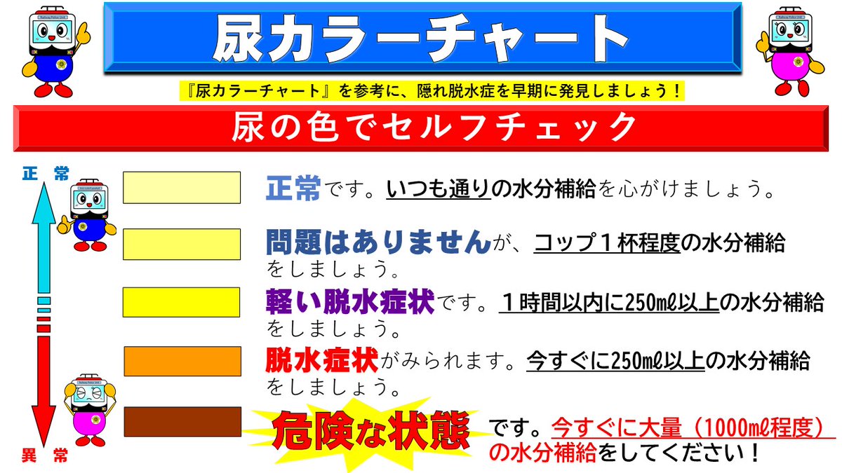熱中症になりやすい季節になってきました。熱中症対策の1つとして、尿の色を観察して「隠れ脱水症」を見つける方法があります。鉄道警察隊でもオリジナルの尿カラーチャートを作成し、日々セルフチェックをして体調..