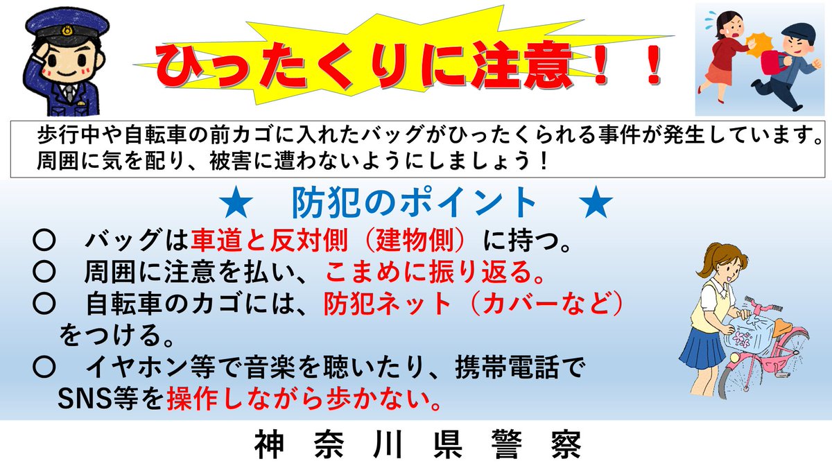 【ひったくりの発生状況】令和6年5月末現在の「#ひったくり」の発生は15件で、前年同期比-6件です。歩行中や自転車の前カゴに入れたバッグがひったくられる事件が発生しています。バッグは車道と反対側に持つ..