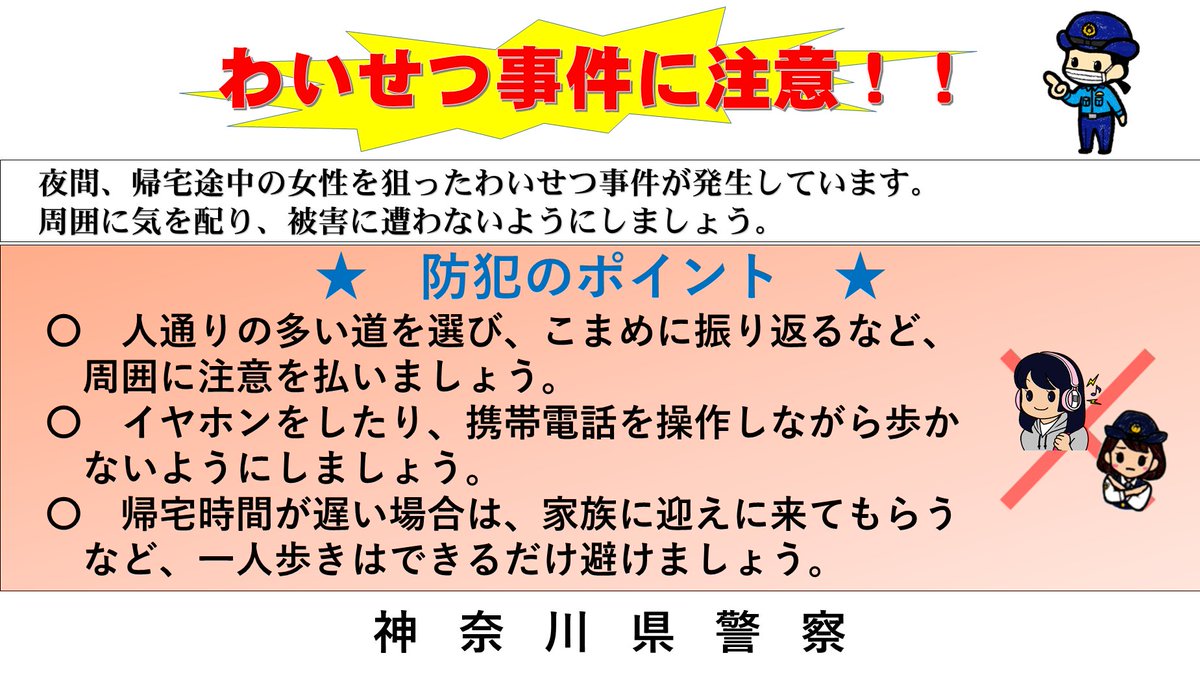【外出時や帰宅時は周囲に気を配りましょう】神奈川県警察防犯大使の森山未唯さんにご協力いただき、外出時の注意点についてまとめた動画を製作しました。イヤホン使用時は人や車が近づいてきても気配を感じにくいの..