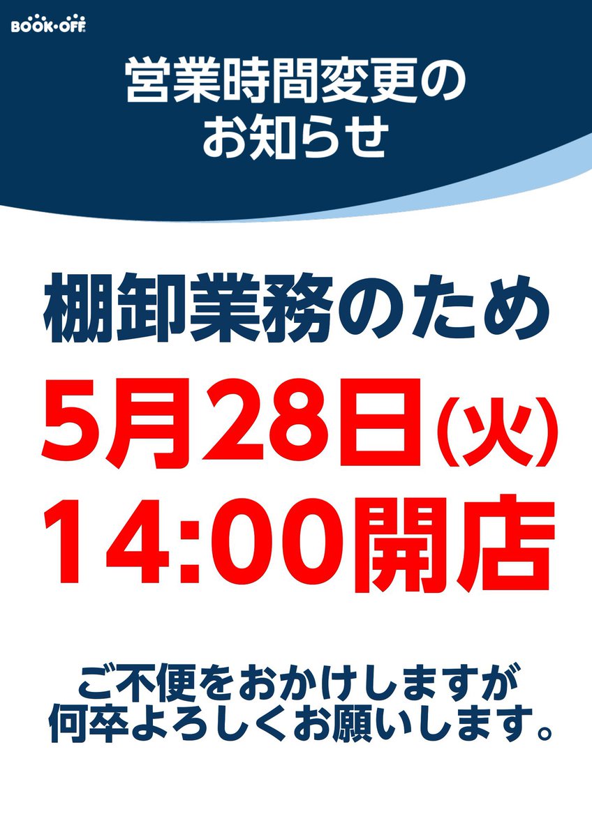【営業時間変更のお知らせ】棚卸し業務のため、5月28日(火)は14時開店となります。ご利用のお客様にはご不便をおかけいたしますが、何卒よろしくお願い致します。