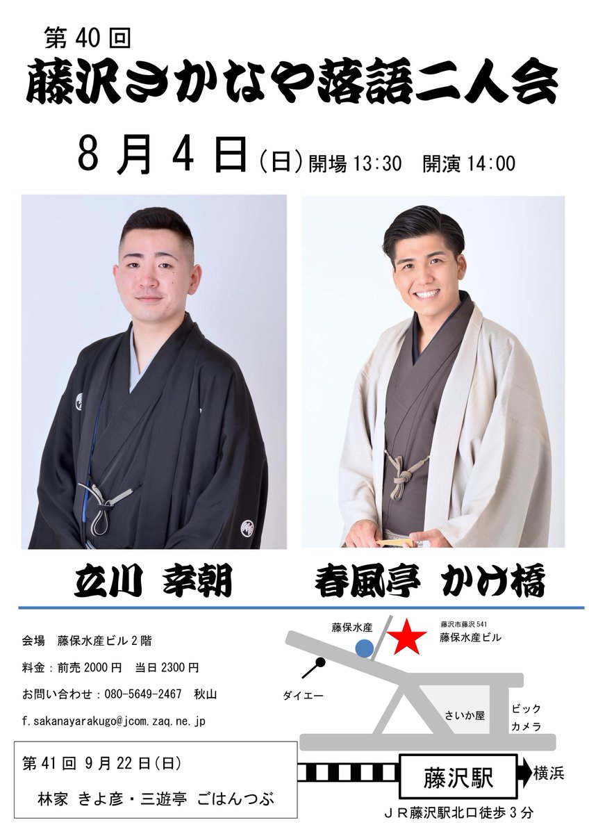 【前売販売中】第40回藤沢さかなや落語二人会日時:8月4日(日)14時〜場所:藤保水産ビル2階出演:立川幸朝春風亭かけ橋料金:前売2000円/当日2300円藤保水産店頭でお求めくださいお問い合わせ:f..