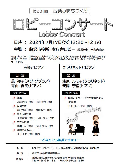 本日7月17日(水)12:20~12:50 藤沢市役所本庁舎1Fロビーにてロビーコンサートを開催いたします。 今回は、声楽とピアノ・クラリネットとピアノの2部構成となります。どなたでもお気軽に、お昼のひとときにお立ち寄りください。