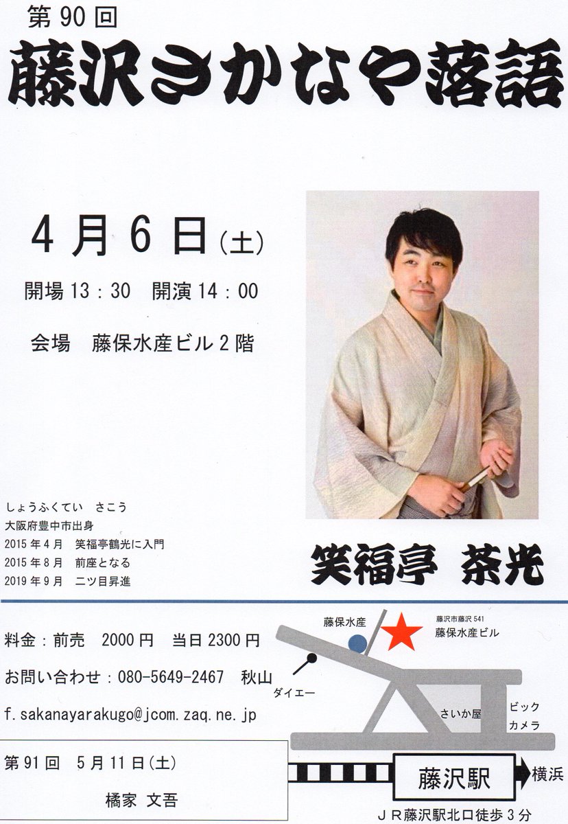 本日第90回藤沢さかなや落語笑福亭茶光さんの会茶光さん昨年8月以来3回目の出演場所:藤保水産ビル2階12時より整理券配布番号順にご入場いただきます天気予報は曇りお気を付けてご来場くださいお待ちしており..