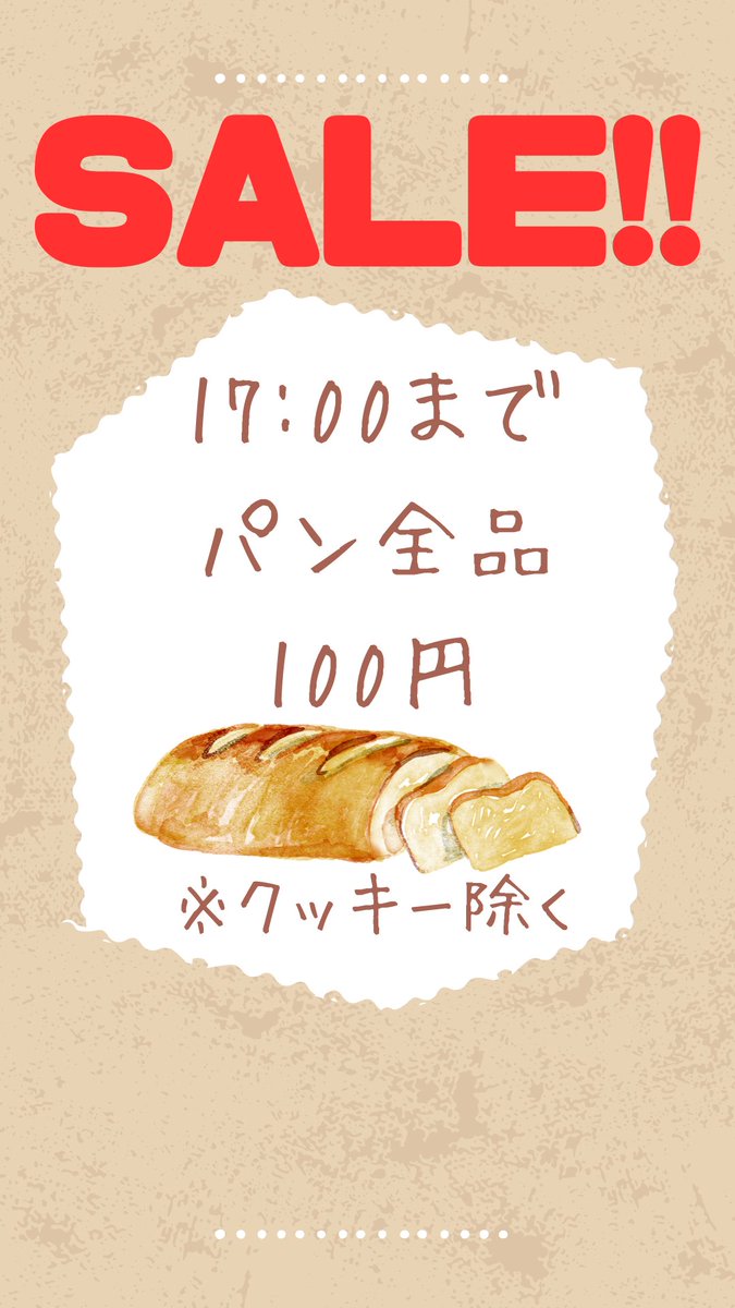 【緊急セール!!】只今より焼き立てパンが全品100円!!17:00まで。無くなり次第終了ですので、お早めにどうぞ!!014