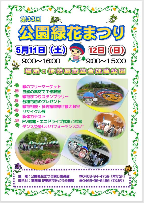 【花と緑の祭典・公園緑花まつりを開催】5/11(土)午前9時~午後4時、12日(日)午前9時~午後3時、総合運動公園。緑のフリーマーケットなど開催。リサイクル展、いせはら環境展、毎日のくらし展(11日..