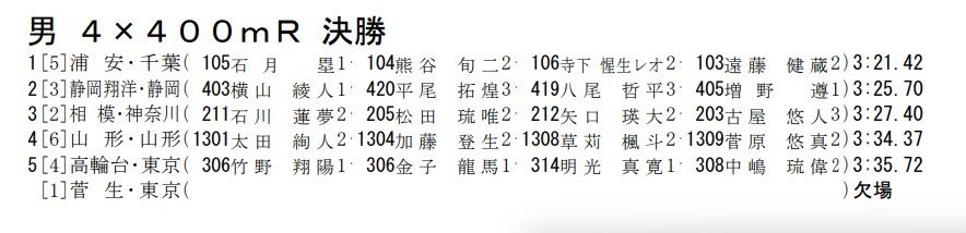 【 2024年度東海大学学園オリンピック 結果 】 男子4×400mR結果になります。 以上で、2024年度東海大学学園オリンピックを終了致します。 とても気温が高く暑い中、皆様お疲れ様でした 競技運営にご協力頂いた皆様、ありがとうございました。